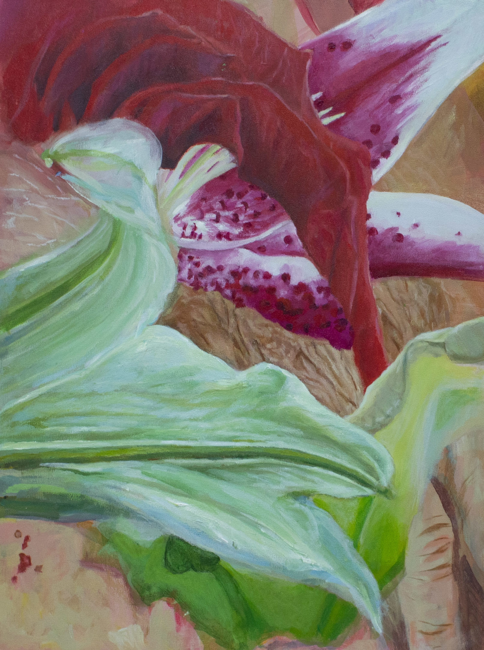 The painting is part of a portrait series of my mother who has worked at a flower shop since our family immigrated to the U.S. This work explores the tendency I have, to make my mixed feelings of her sacrifices more beautiful. Juxtaposing her allergy-prone flesh and flowers I meditate on the purpose of my process and hers.