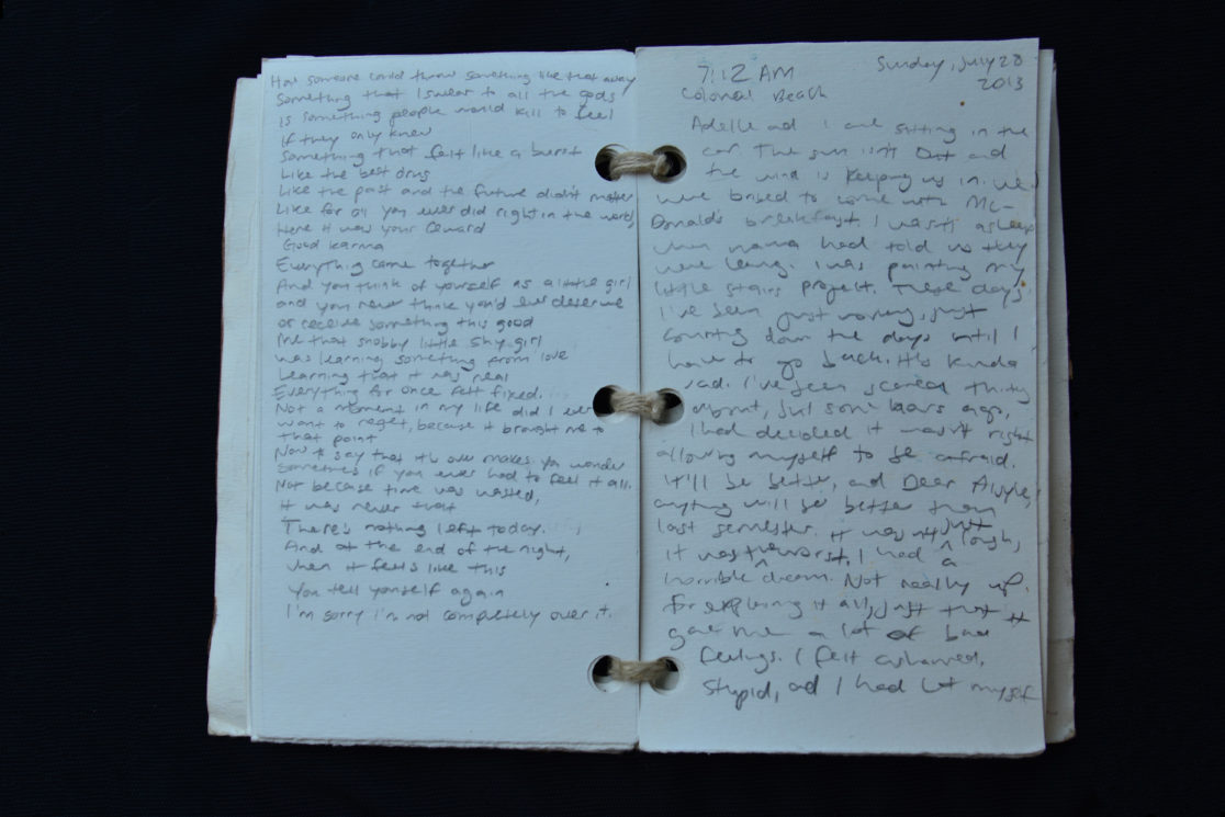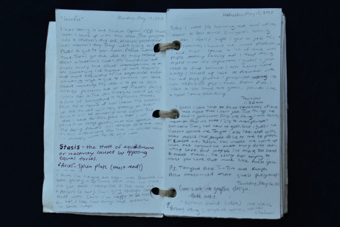 I created the journal out of old art material that I had stowed away in my old attic room. It was a hot summer–a haze now (yes pun intended), but it was at that time I was making sense of my past relationship. I wrote personal reflections and aspirations as an artist while moving forward from the feelings of attachment.
