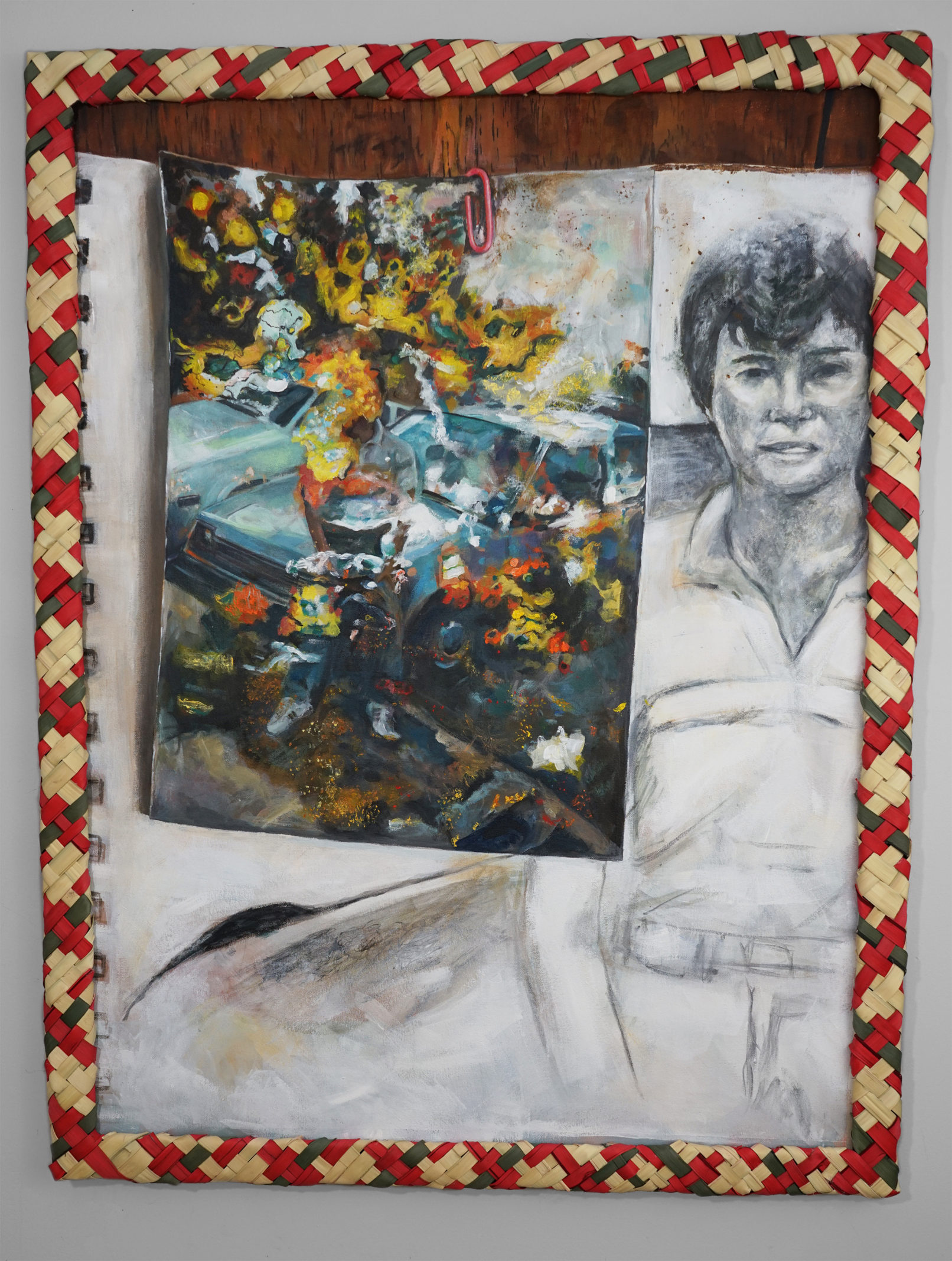 Acrylic paint on canvas, and dyed palm leaves